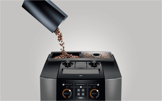 Die beiden Bohnenbehälter im Turbinen-Design erinnern an den kraftvollen Motor eines Sportwagens und bringen damit Luxus und Höchstleistung auf den Punkt.
