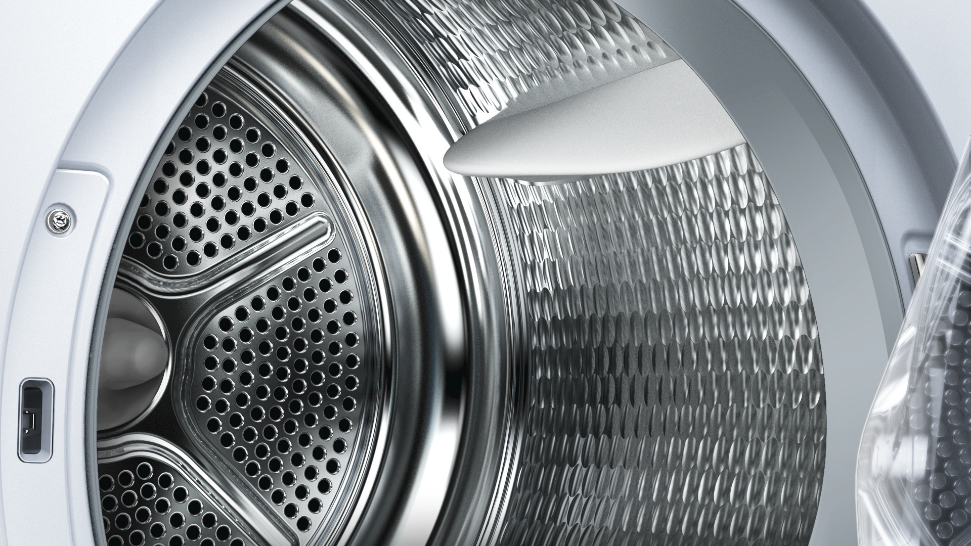 Das einzigartige Trommelsystem sorgt für permanenten Luftstrom und eine konstante Temperatur. Die geschwungenen Mitnehmer wirbeln die warme Luft auf – und verteilen die Wäsche sanfter und effizienter als bisher möglich. Mit der neuen, wäscheschonenden Trommelstruktur gleitet die Wäsche wie auf einem Luftpolster durch die Trommel.